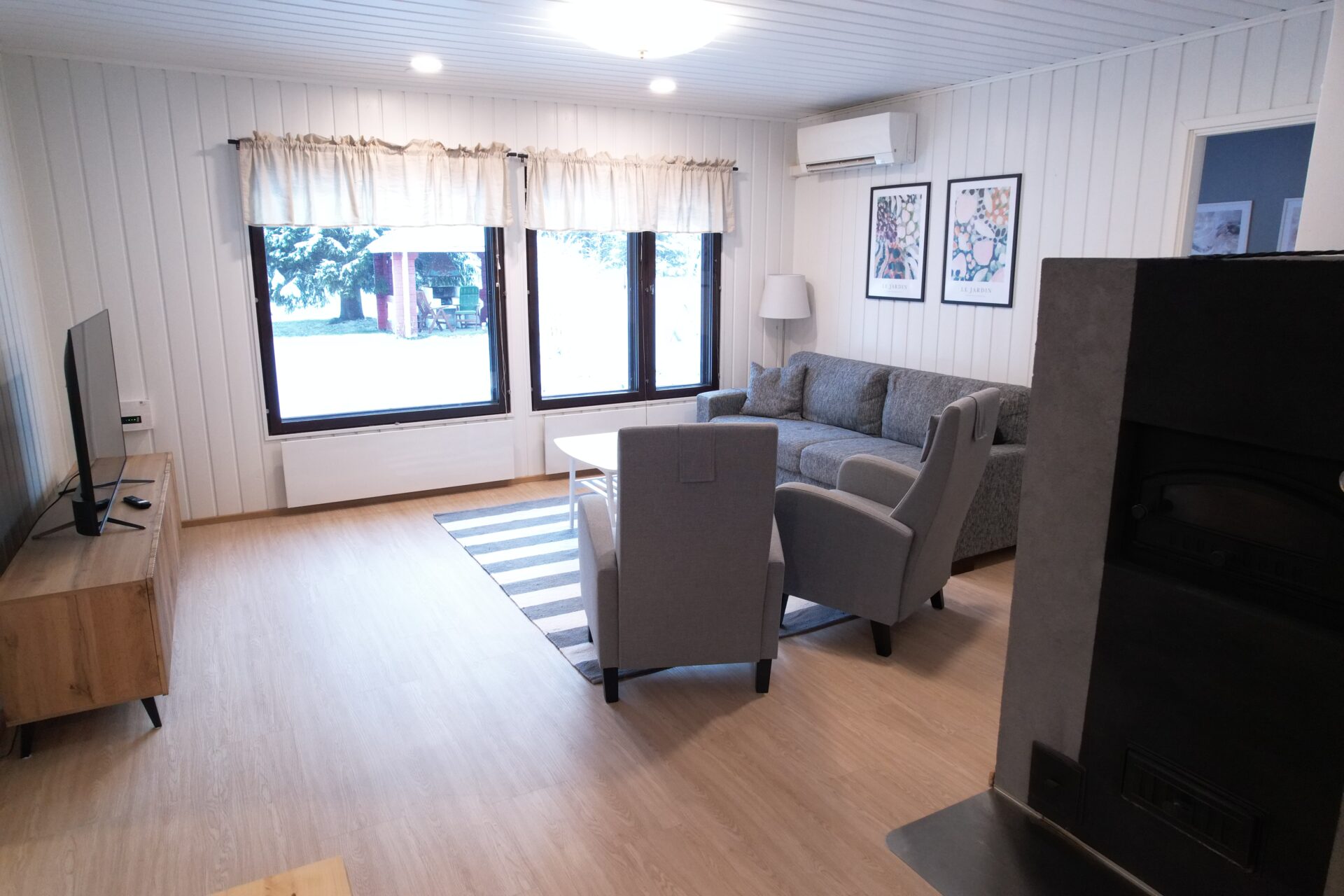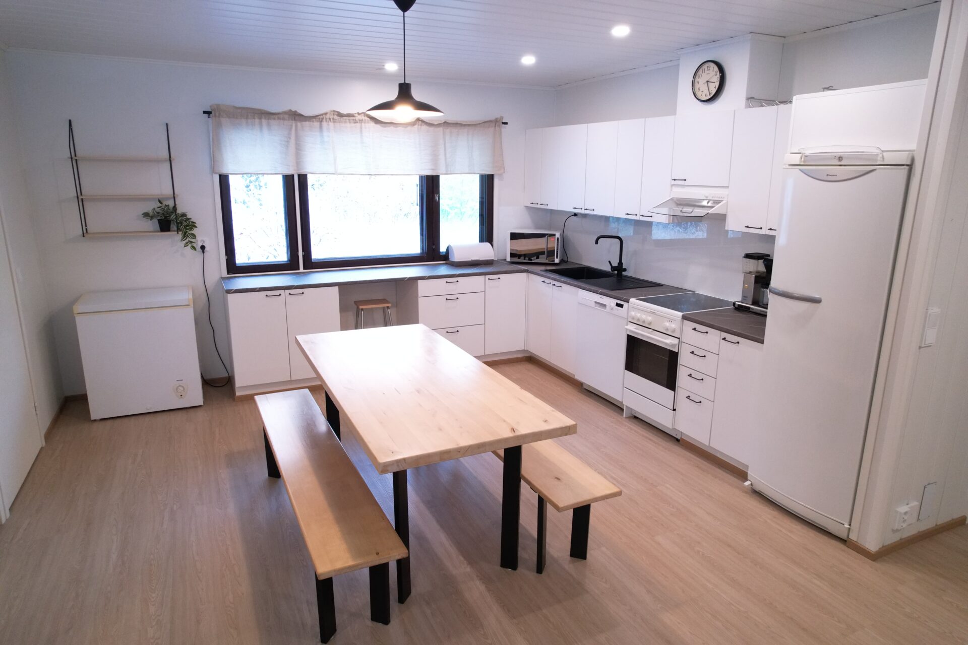 Varustelu: 100 m2, 3 makuuhuonetta, 6 sänkyä ja levitettävä vuodesohva, jääkaappi, pakastin, sähköhella, tiskikone, kahvinkeitin, vedenkeitin, leivänpaahdin, mikroaaltouuni, astiat, pyykinpesukone, sähkösauna, älytelevisio, langaton laajakaista, takka, polttopuut ja oma grillikatos.